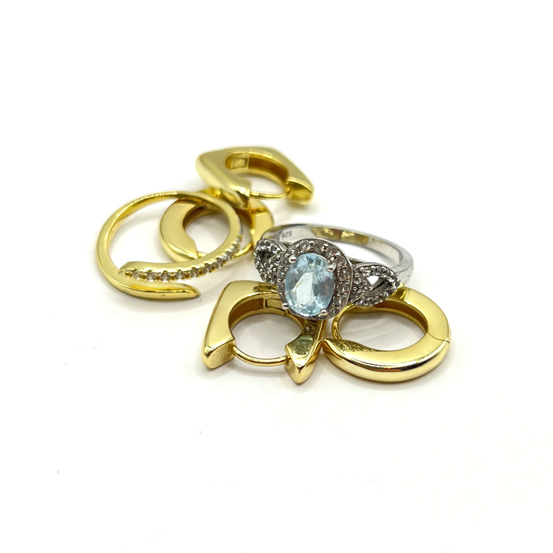 A curated everyday jewelry collection featuring a sterling silver sapphire ring, a durable adjustable gold ring, and small chunky gold hoops. Each piece is personal, reliable, and adds subtle sparkle to every outfit.